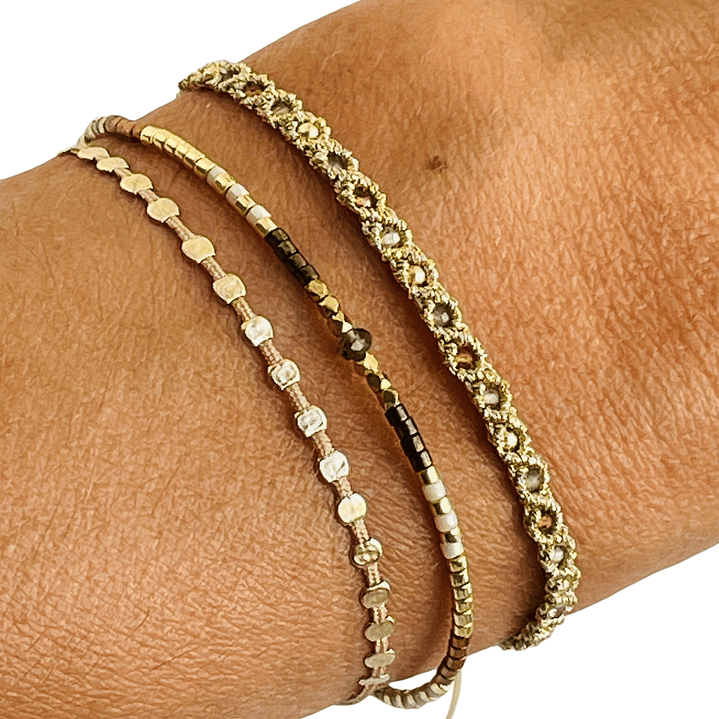 Esta pulsera está hecha por nuestro equipo de artesanas usando cuentas de vidrio japonés al estilo Miyuki en tonos neutrales. Dale a tus muñecas protagonismo en tu look combinando esta pieza con tus joyas favoritas.